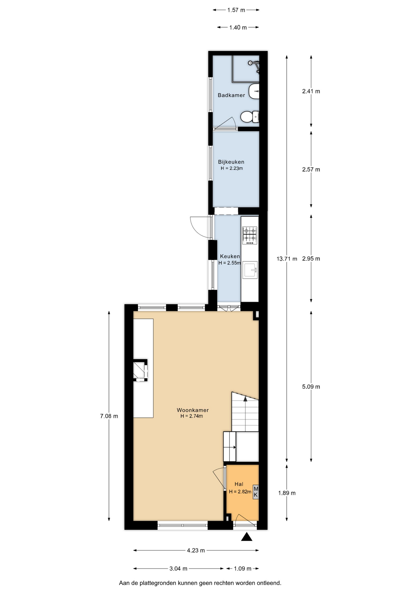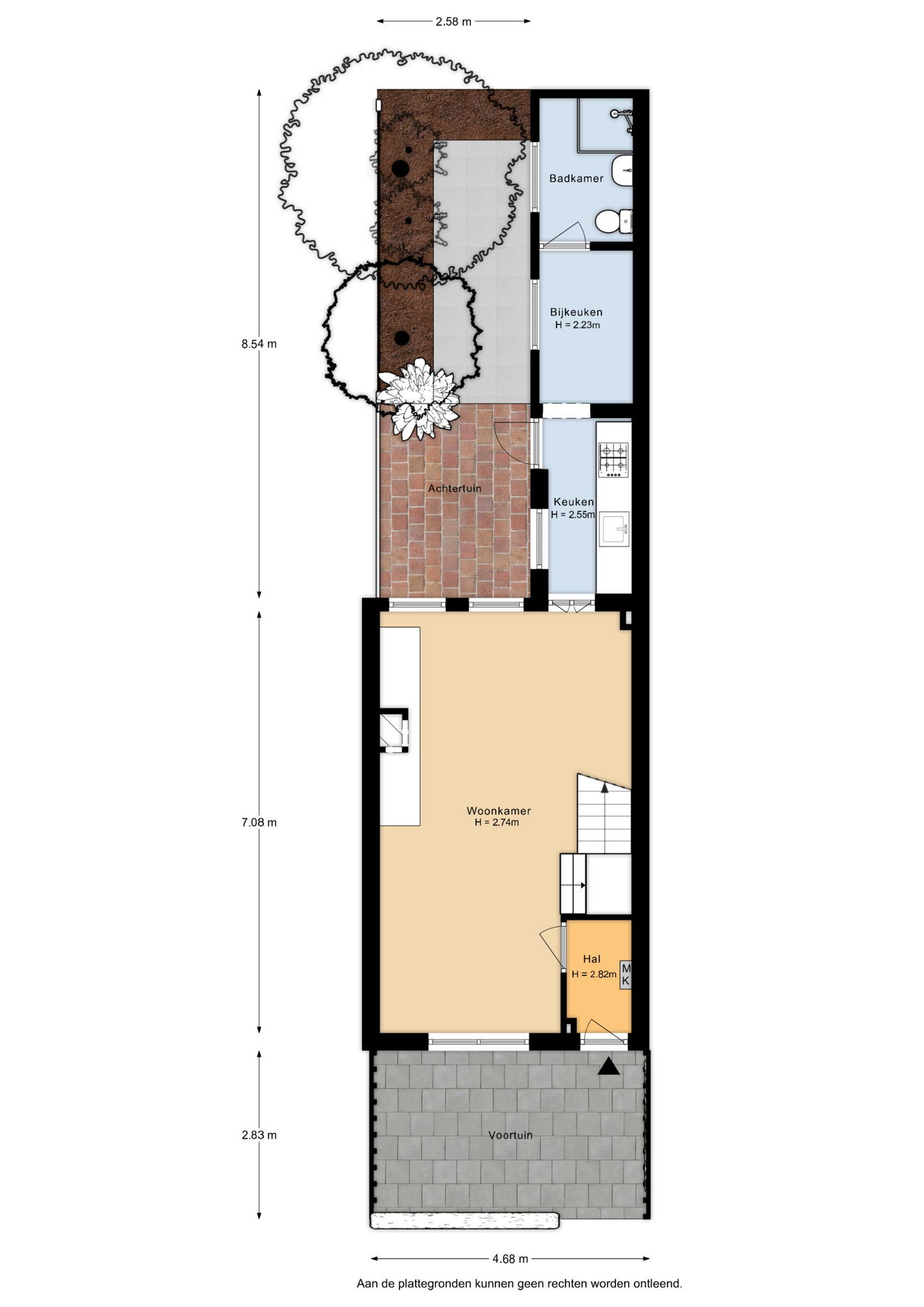Aan de achterzijde ligt de keuken, voorzien van diverse inbouwapparatuur en een houten werkblad. Achter de keuken bevinden zich de bijkeuken en de badkamer met douche, wastafel en toilet. Vanuit de keuken stap je de achtertuin van circa 22 m² in, waar je heerlijk van de ochtend- en middagzon kan genieten.