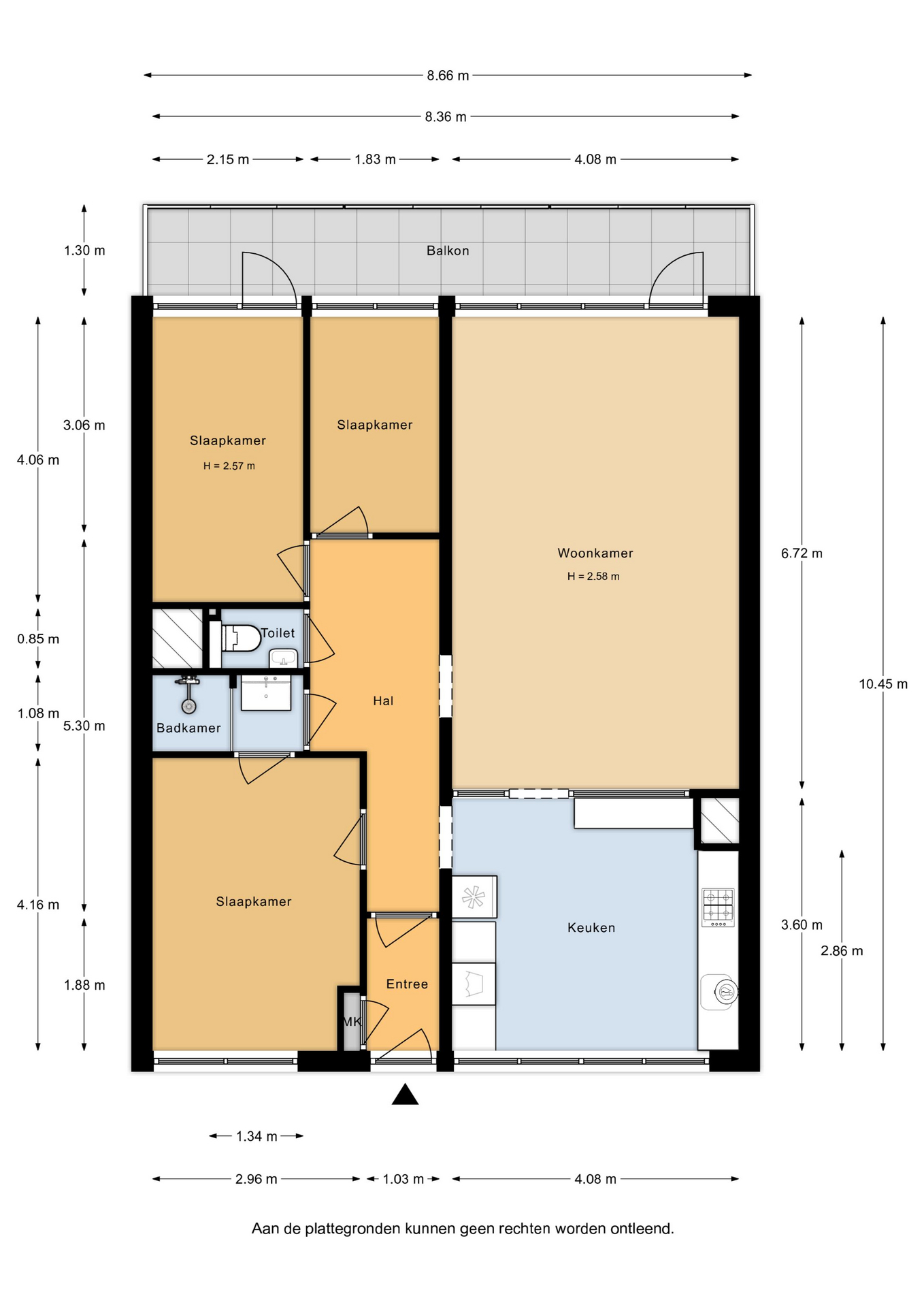 Er zijn drie slaapkamers, waarvan één met toegang tot het balkon. De badkamer is voorzien van een douche en wastafelmeubel; het toilet is separaat.