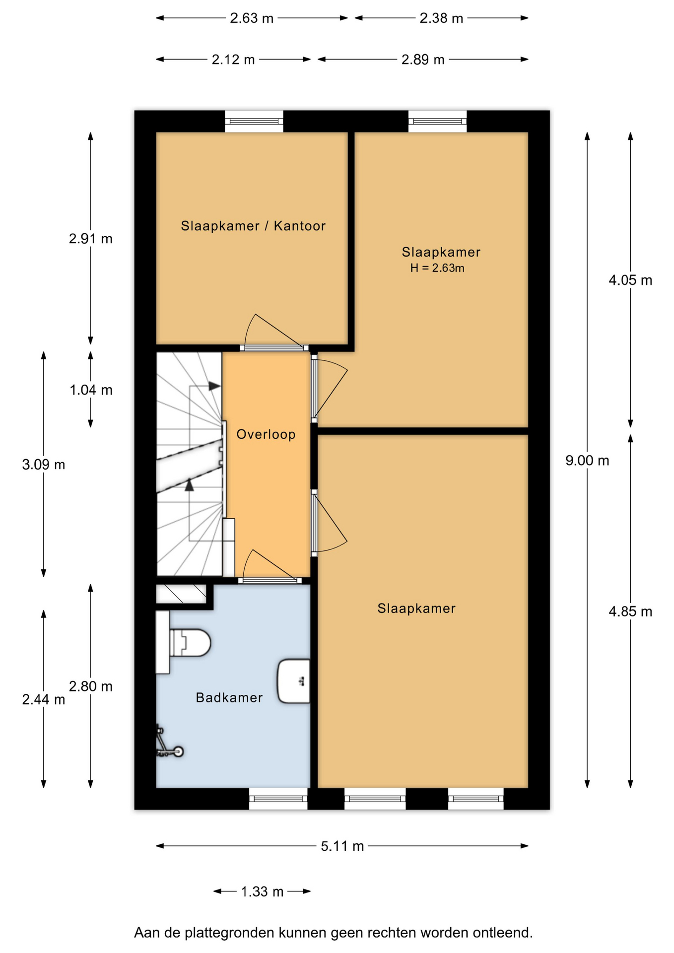 De overloop geeft toegang tot drie ruime slaapkamers en de badkamer. Alle slaapkamers zijn goed van formaat en flexibel in te richten, bijvoorbeeld als werk-, kinder- of logeerkamer.