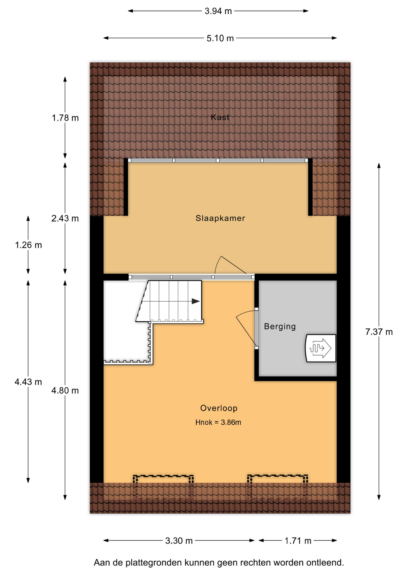 Aan de achterzijde bevindt zich een slaapkamer met een kunststof dakkapel over de volledige breedte. Achter de knieschotten is extra bergruimte aanwezig. Daarnaast is er een aparte technische-/wasruimte met de opstelling voor de wasmachine, warmtepomp en mechanische ventilatie.