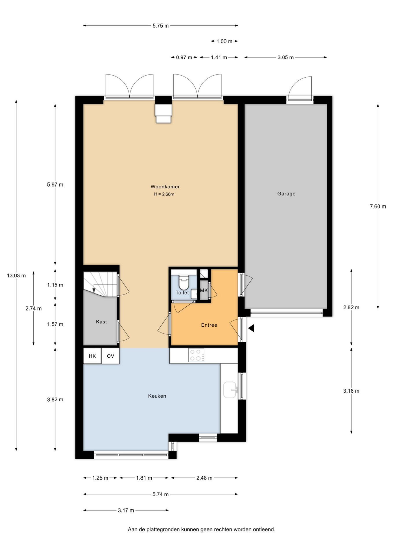 Through the entrance you arrive in the hallway with the meter cupboard and a modern toilet room equipped with a wall-mounted toilet and washbasin. From here you have access to the living room and the spacious garage of approximately 23 m².