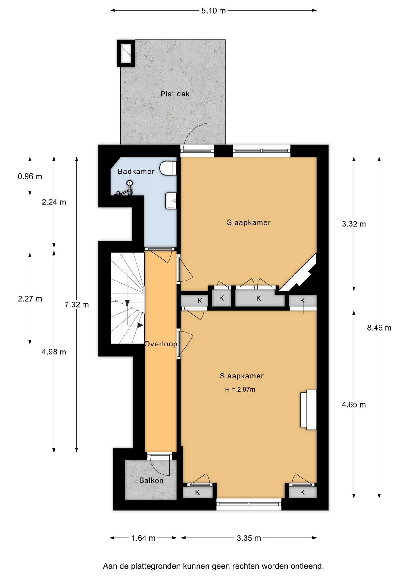 De overloop geeft toegang tot twee royale slaapkamers, beide met hoge plafonds en praktische vaste kasten. De badkamer is compleet met douche, wastafel en toilet.